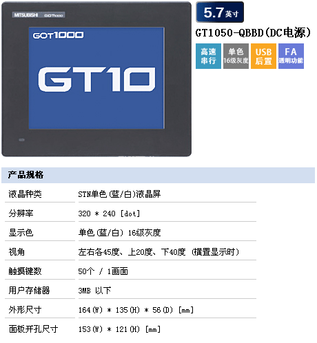 GT1050-QBBD-C | 5.7寸QVGA,STN藍白16灰度,直流24V供電,帶232/422接口,USB下載 |