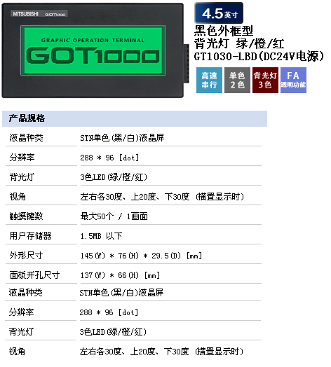 GT1030-LBD-C | 4.5寸,STN藍白藍色,直流24V供電,RS-232下載 |